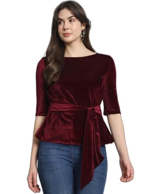 Chicava Party Top for Women with Front Tie Waistband | Shiny Velvet Half Sleeeves Stylish Outfit