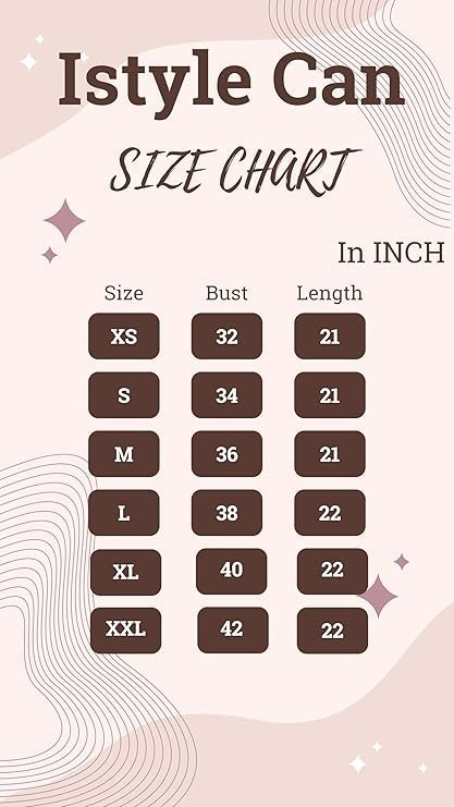 - SIZE CHART ( inch ) :XS-Chest-32,Length-21, S-Chest-34,Length-21, M-Chest-36,Length-21, L-Chest-38,Length-22, XL-Chest-40,Length-22, XXL-Chest-42,Length-22,