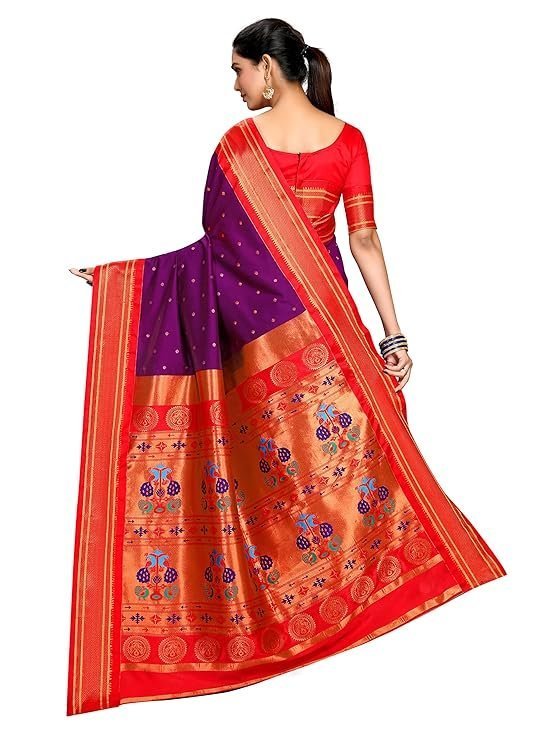 - Saree details- Saree Color: Purple & Red | Saree Material: 70% Polyester, 30% Silk | Saree Length: 5.5 Mtr | Saree Print: Woven | Saree Work Type: Small Copper Zari Butti