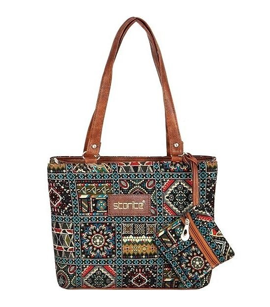 Storite Women’s Tote Bag With Leather Handles & Embroidery Printed Handbag With Zip Pockets, Shoulder Tote Bag And Handbag For Office And College